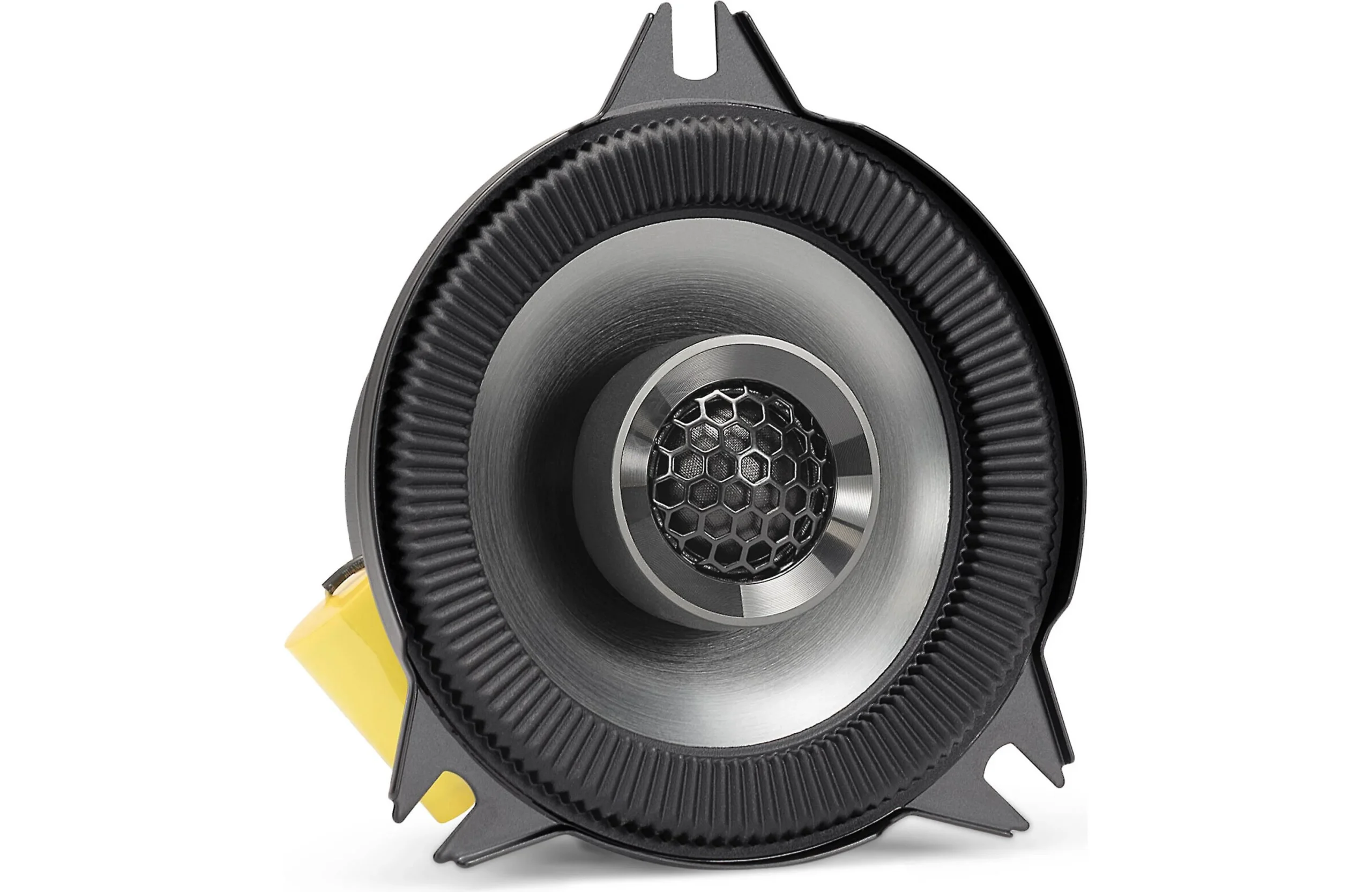 The Alpine BRV-S40 4″ coaxial speakers are an excellent way to add life to your sound. In fact, they’re Hi-Res Audio Certified by the Japan Audio Society (JAS). These coaxial speakers combine rigid, high-excursion woofers with 3/4″ tweeters in a combo that Alpine has designed and tested to maximize the Optim DSP output from select Alpine amplifiers. The woofer features Alpine’s new H.E.D.G.E. multi-roll surround with a corrugated design, so stress is spread across the ribs you see in the image below. The ribs act like an expansion joint so the cone travels without stretching the surround too much. This design is usually found on high-excursion subwoofers, where a speaker needs long travel and great control.